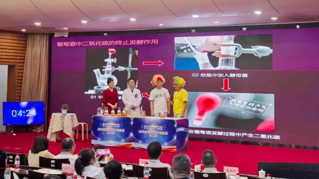 展演期间,市食品药品检验所代表队以《“硫”言蜚语——葡萄酒中二氧化硫的妙用》为题,通过模拟实验剧场场景,由检验人员与“酒神”“酵母菌”“二氧化硫”“监管人员”等角色互动,队员们凭借扎实的专业知识和生动的舞台表现,娴熟地演示了二氧化硫在葡萄酒中的抗氧化、澄清及终止发酵等关键实验,并以通俗易懂的语言和清晰的实验操作,深入浅出地解读了食品安全国家标准和饮用葡萄酒的注意事项。整个展演过程科学严谨、生动有趣,成功引导公众科学理性看待食品添加剂,现场气氛热烈,最终凭借出色的整体表现赢得了评委和观众的高度认可与掌声。参赛作品成功入围“2025 年度市场监管科学实验展演优秀作品名单”。