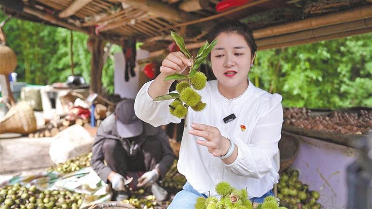 9月4日,助农主播在佛坪县陈家坝镇陈家坝村三佛沟直播售卖核桃、板栗。 受访单位供图