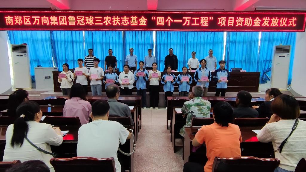 三秦都市报-秦闻讯(记者 姬娜)9月16日上午,汉中市南郑区慈善协会在南郑中学举行万向集团鲁冠球三农扶志基金“四个一万工程”项目资助金发放仪式,为151名大中小学生和孤困老人集中发放资助金30.71万元。相关部门负责人、受助学生和孤困老人等170余人参加活动。