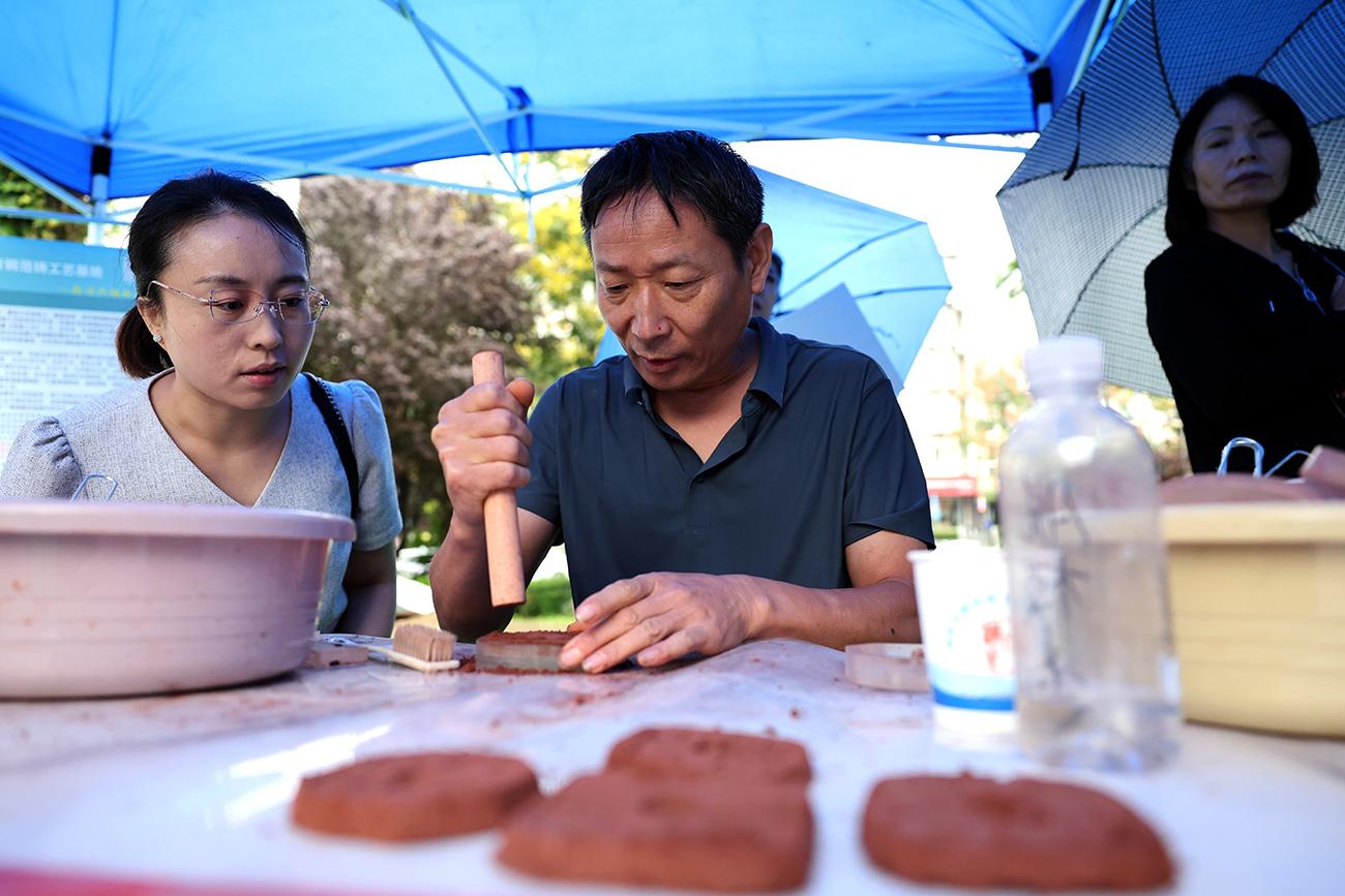 咸阳青铜范铸工艺研究所也带来了特色展示,让居民近距离感受青铜文化的魅力,通过实践手工提高动手能力,工作人员用红土指导现场居民制“模”并讲解如何用铜水“范”入。一位市民陈女士高兴地说,自己用榫卯结构制“模”并了解到西安汉时期面额比较小的“五铢”,并了解到“模范”一词的起源与工艺传承。