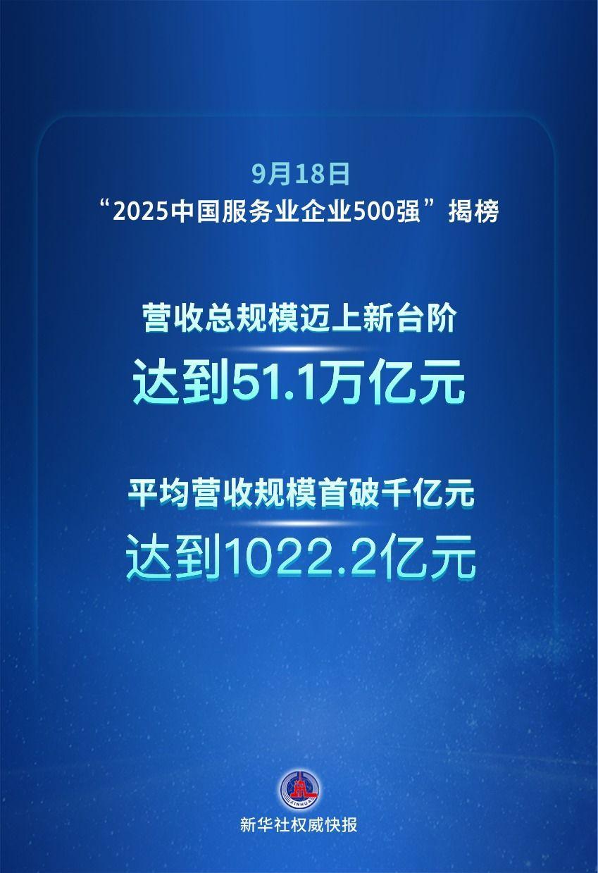 9月18日,中国企业联合会、中国企业家协会在重庆发布“2025中国服务业企业500强”。入围企业2024年营业收入总规模迈上新台阶,达到51.1万亿元,平均营业收入规模首次突破千亿元大关,达到1022.2亿元。