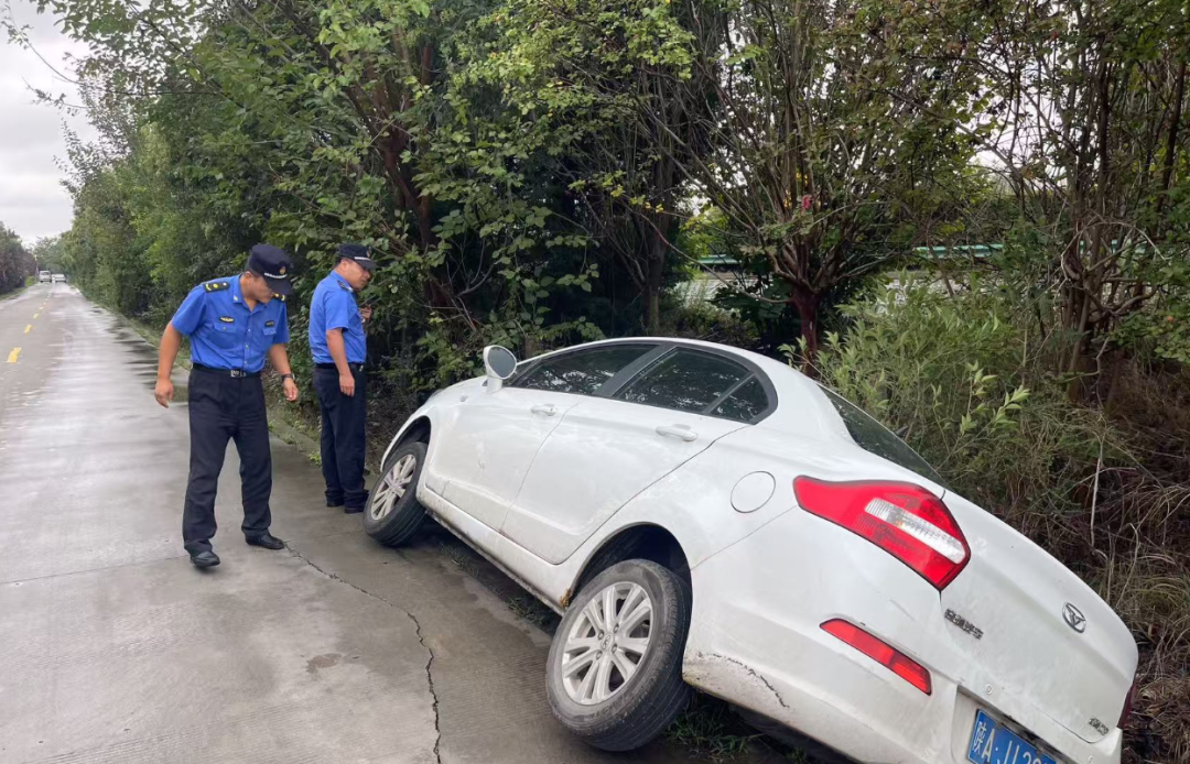 西咸新区综合行政执法支队泾河大队执法人员在巡查西铜辅道时,发现一辆轿车因弯道操作不慎侧滑进入路边沟渠,无法移动。执法队员迅速设置反光警示架,引导当事人撤离至安全区域,有效防范二次事故发生,保障道路交通秩序与人员安全。