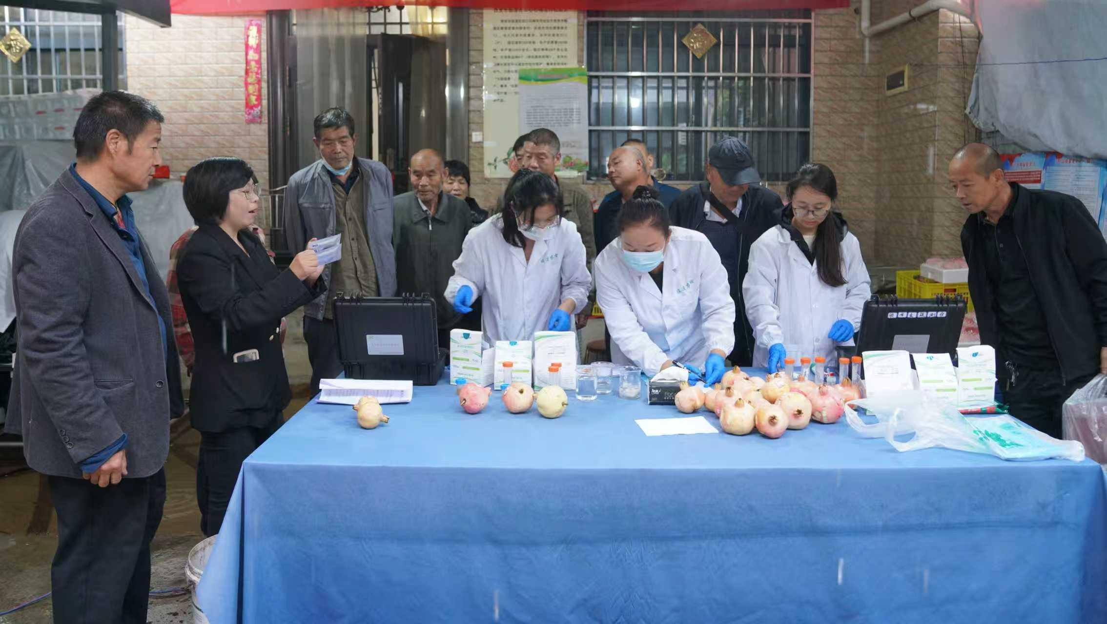理论培训后,临潼区农产品质量安全检验监测中心工作人员在现场搭建起临时检测台,果农们纷纷拿来自家石榴样本排队检测。技术人员熟练地对样品进行编号、处理、提取和上机检测,不一会儿结果就在仪器上显示出来。
