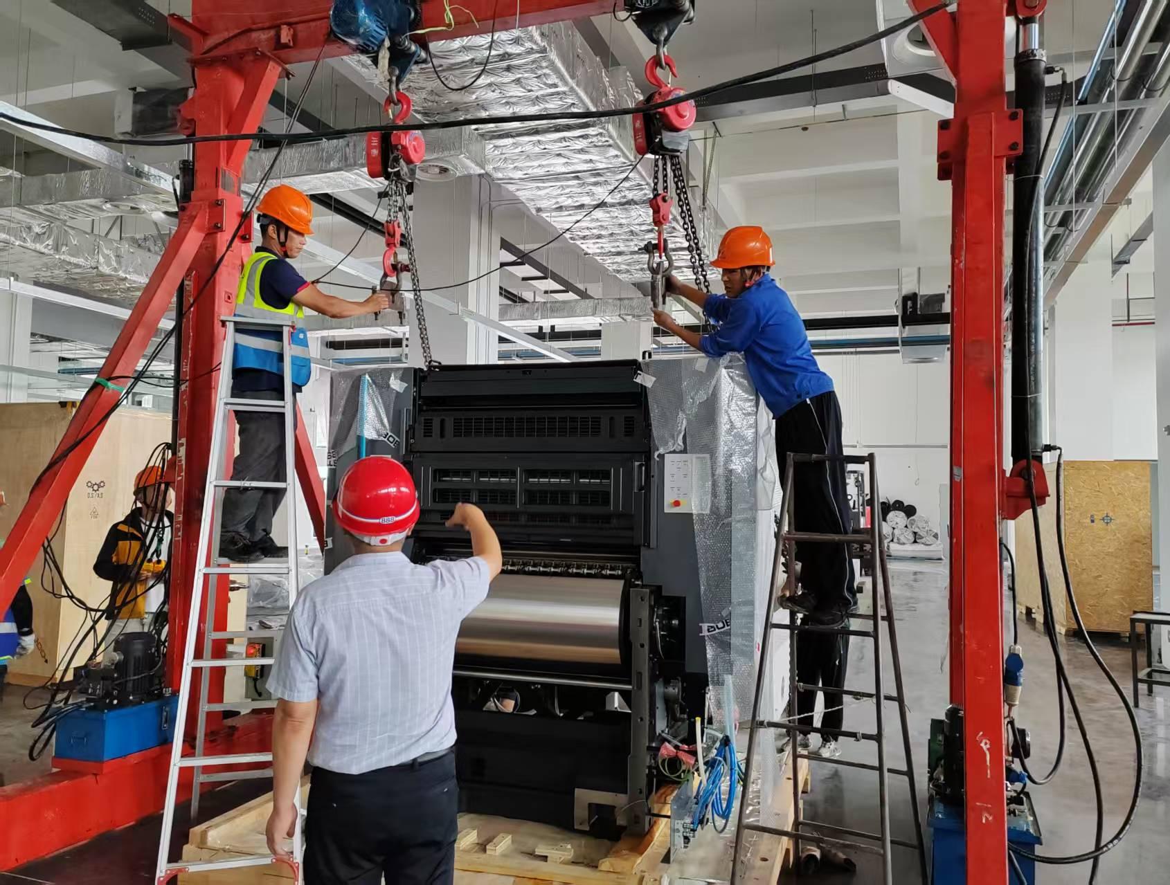 当前,纸盒车间一批先进设备已陆续抵场并有序就位,包括海德堡CX104-8+L CN印刷机、海德堡CX104-5+L CN印刷机、两台京隽SF7800喷码机、一台京隽SF8800喷码机、长荣臻•MK1060CSB全清废模切机、长荣臻•MK1060VF烫金机、两台博斯特美龙800粘盒机以及一台长荣戴安娜850粘盒机。海德堡CX104-8+L CN对开印刷机正在厂方技术人员专注投入下进行色组调平与拼接安装;三台京隽喷码机已全部完成设备拼接调平,3号喷码机正加紧进行自动物流安装。