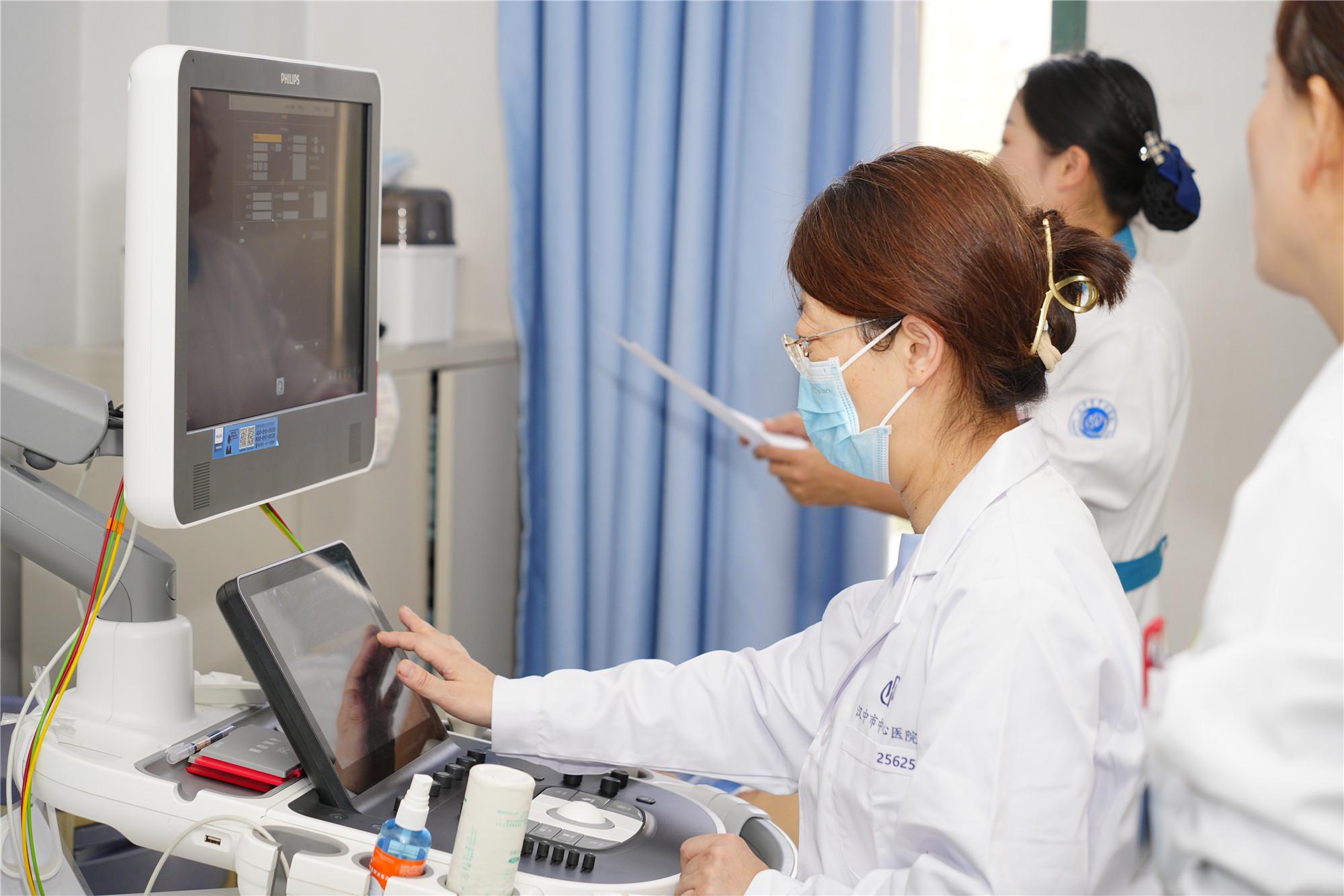 与此同时,来自北京医院的钟优主任前往超声室,沉浸式带教。针对负荷超声心动图的操作流程、图像分析等进行交流和演示:每一个操作步骤精准而熟练,边操作边细致地讲解着其中的要点,从仪器的调试到检查时的角度选择,并重点演示了关键参数的获取技巧及误区纠正。为超声团队赋能,进一步规范超声操作技能,未来为广大患者提供更精准、更优质的诊疗服务。
