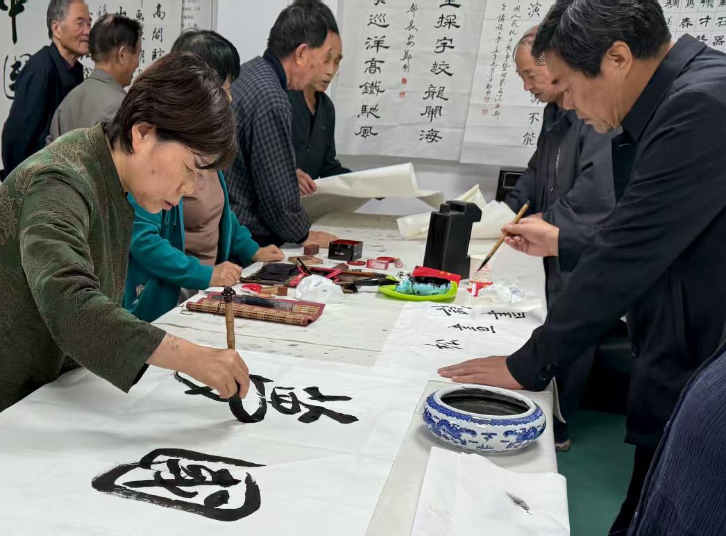在书画交流环节,临潼区老年书画学会的书法爱好者们现场挥毫泼墨,以精湛的技艺描绘山河壮丽、书写盛世华章。一幅幅以国庆、祖国山河和传统文化为主题的书画作品,展现了艺术家们的艺术技艺和对祖国的深情厚爱。