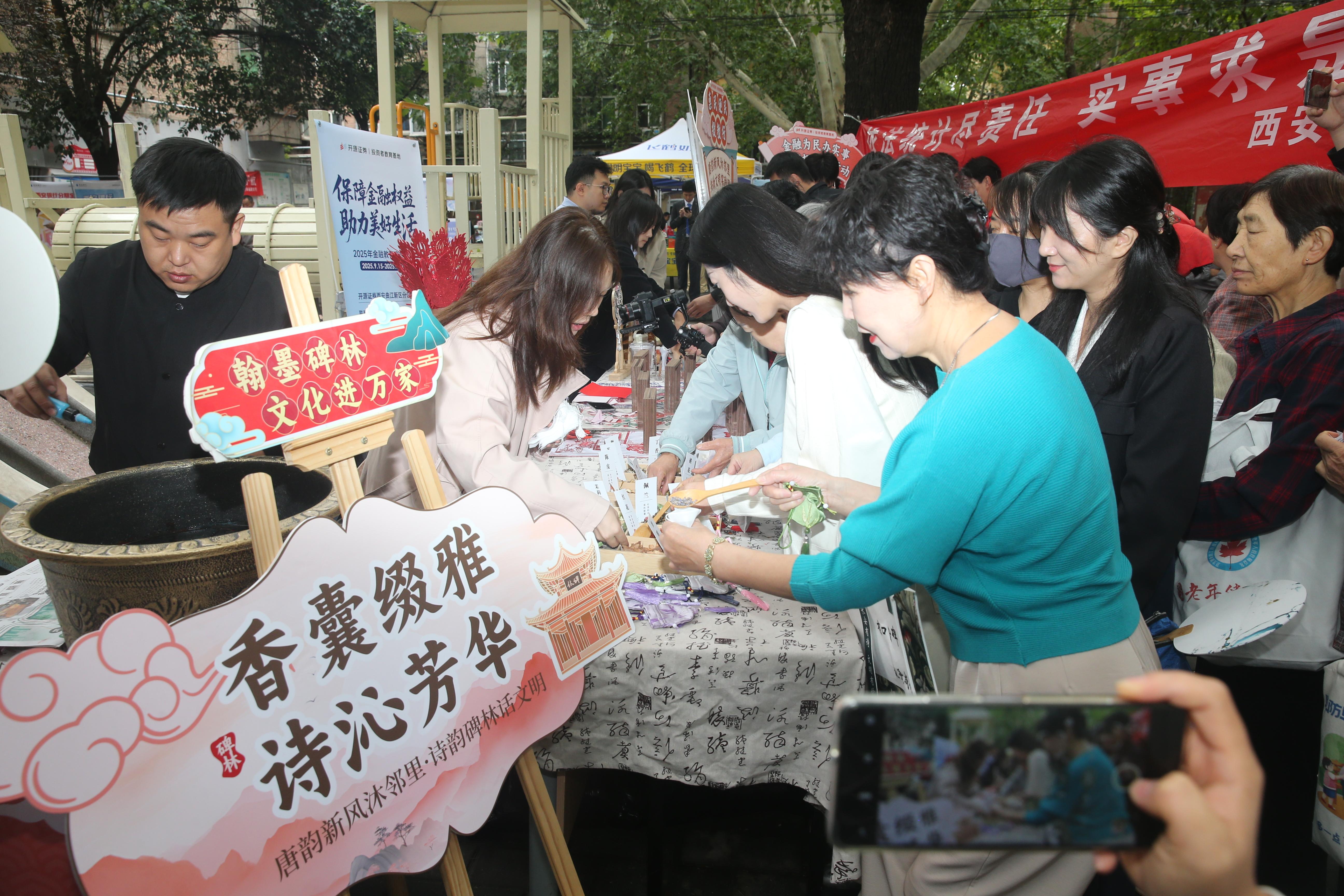 活动现场还设置了“一刻钟文明实践圈”便民集市,提供义诊、义剪、磨刀、贴膜等惠民服务,并融入非遗剪纸、漆扇制作、香囊手作、唐诗互动等传统文化体验项目,让居民在便捷生活服务中切身感受唐诗的艺术渗透力和传统手工艺的当代活力。