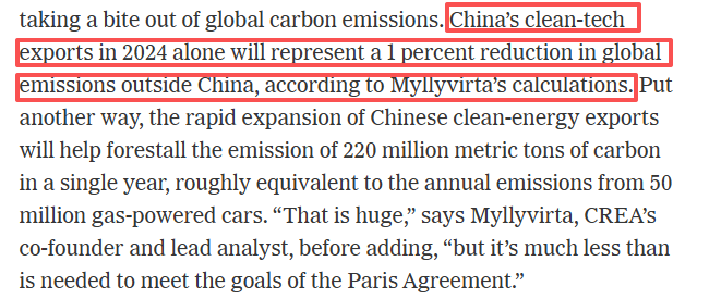 根据米利维尔塔的计算,仅2024年中国出口的清洁技术就意味着一年内能阻止2.2亿吨碳的排放,约相当于5000万辆燃油车一年的排放量。文章认为,这意味着,中国清洁能源相关出口已经削弱了全球碳排放。