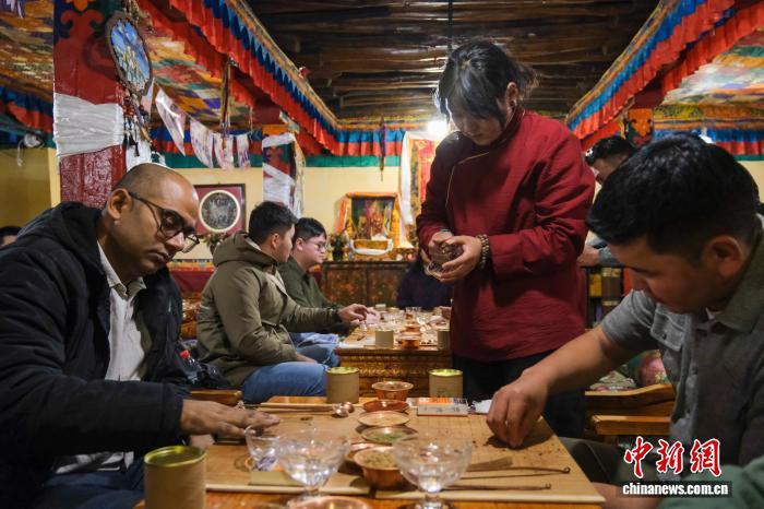 9月18日,多国媒体人员、公务人员在拉萨八廓街邦达仓古建大院体验手工藏香制作。 中新社记者 江飞波 摄
