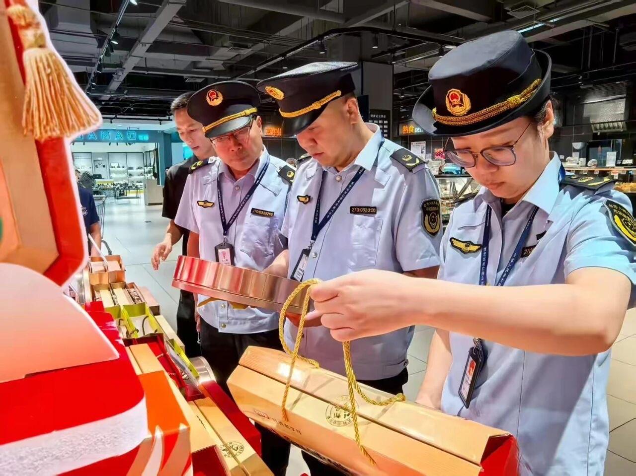 在中大型商超,执法人员联合第三方检验机构,将月饼、面点、糕点等节令食品作为检查重点。执法人员严格核对食品生产日期、保质期、储存条件及标签标识,细致排查过度包装、虚假标注等问题,严厉打击销售“三无”、过期、变质食品的违法行为。同时,针对粮油、乳制品、肉类等节日热销商品,执法人员逐一查验进货凭证与检验检疫证明,督促商超严格落实进货查验制度,确保每一件食品来源安全可追溯。