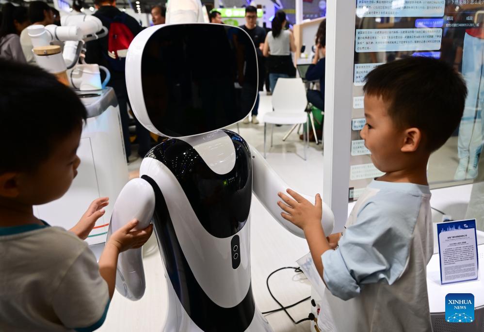 Visitors interact with a robot at the 2025 World Manufacturing Convention in Hefei, east China's Anhui Province, Sept. 21, 2025.