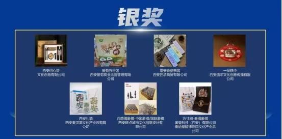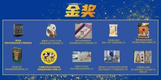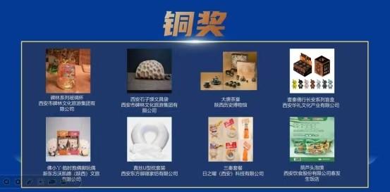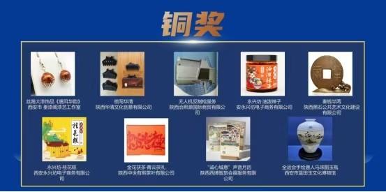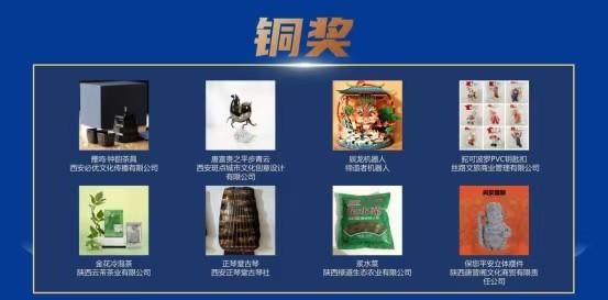 雁鸣·钟韵茶具、唐富贵之平步青云、辰龙机器人、驼可波罗PVC钥匙扣、金花冷泡茶、正琴堂古琴、浆水菜、保您平安立体摆件、碑林系列玻璃杯、西安石子馍文具袋、大唐茶宴、壹秦俑行长安系列盲盒、佛小丫·临时抱佛脚玩偶、真丝U型枕套装、三秦套餐、葫芦头泡馍、丝路大漆饰品《唐风华韵》、梳写华清、无人机反制枪服务、永兴坊·油泼辣子、永兴坊·桂花糕、金花茯茶·青云茯礼、“诚心城意”声音月历、全运会手绘唐人马球图玉瓶、秦钱半两25件作品拿下铜奖;