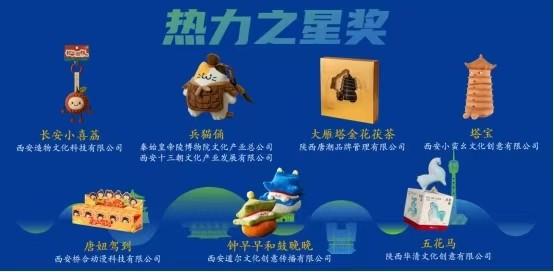 此外,唐妞驾到、塔宝、大雁塔金花茯茶、兵猫俑、长安小喜荔、五花马、钟早早和鼓晚晚7件作品凭借高人气获得热力之星奖。