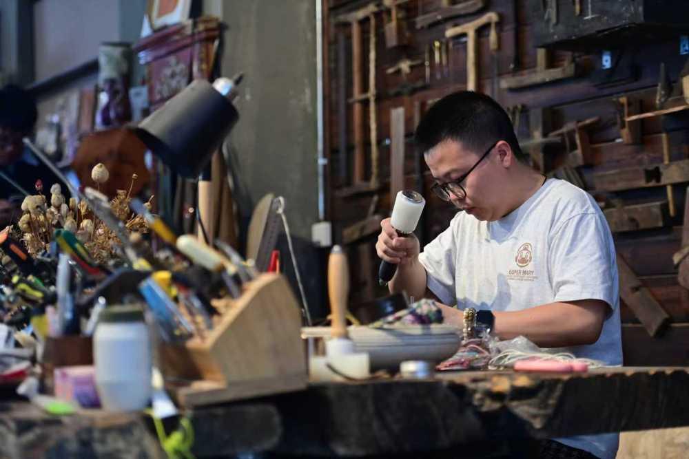 当地传统皮革手工技艺多做马鞍、传统皮鞋,曹红兵凭借其设计专业的优势,在传承传统技艺的基础上大胆创新,将当地人文历史、民俗风情融入作品,推出羊皮烫画等文创作品。融入了哈萨克毡房、少数民族乐器等元素的文创产品,成为游客体验非遗的热门选择。“游客亲手制作时,能更深入了解新疆文化,这就是文旅融合的意义。”曹红兵说,目前工坊还享受到房租减免等政策扶持,为非遗传承注入了更多动力。