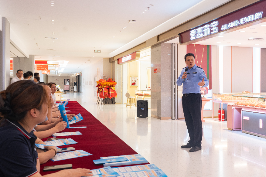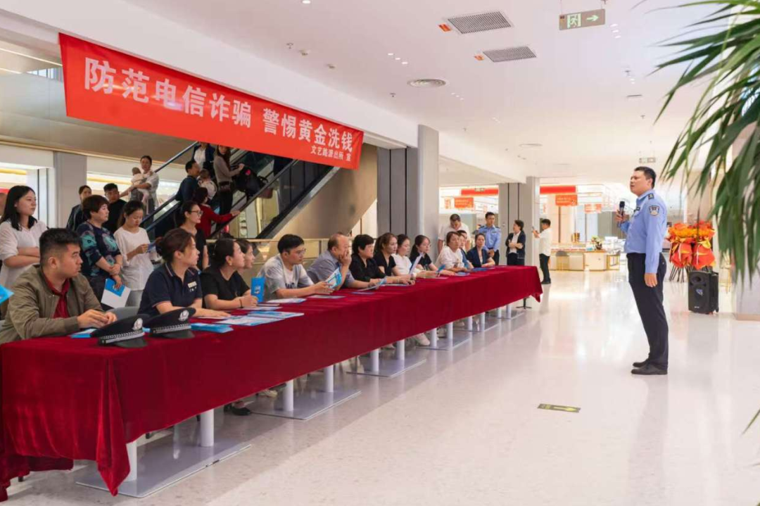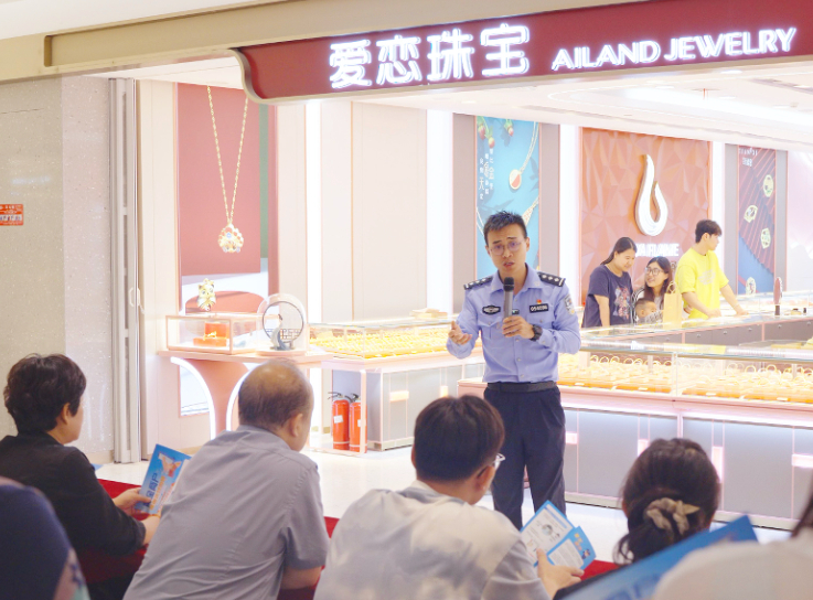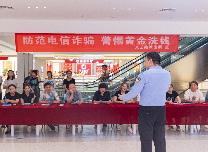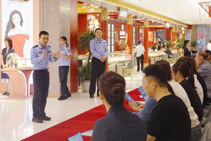 三秦都市报-三秦网讯(记者 葛兰)“如遇可疑大额买金‘客户’,不要只看业绩和效益,务必多核实用途去向,及时报警求助,警惕不法分子利用黄金洗钱……”9月17日,公安碑林分局文艺路派出所民警走进辖区李家村黄金珠宝城,开展了一场别开生面的反诈宣传活动——“防范电信诈骗,警惕黄金洗钱”。他们不只是来讲课的,更是来为广大群众的“钱袋子”站岗的。