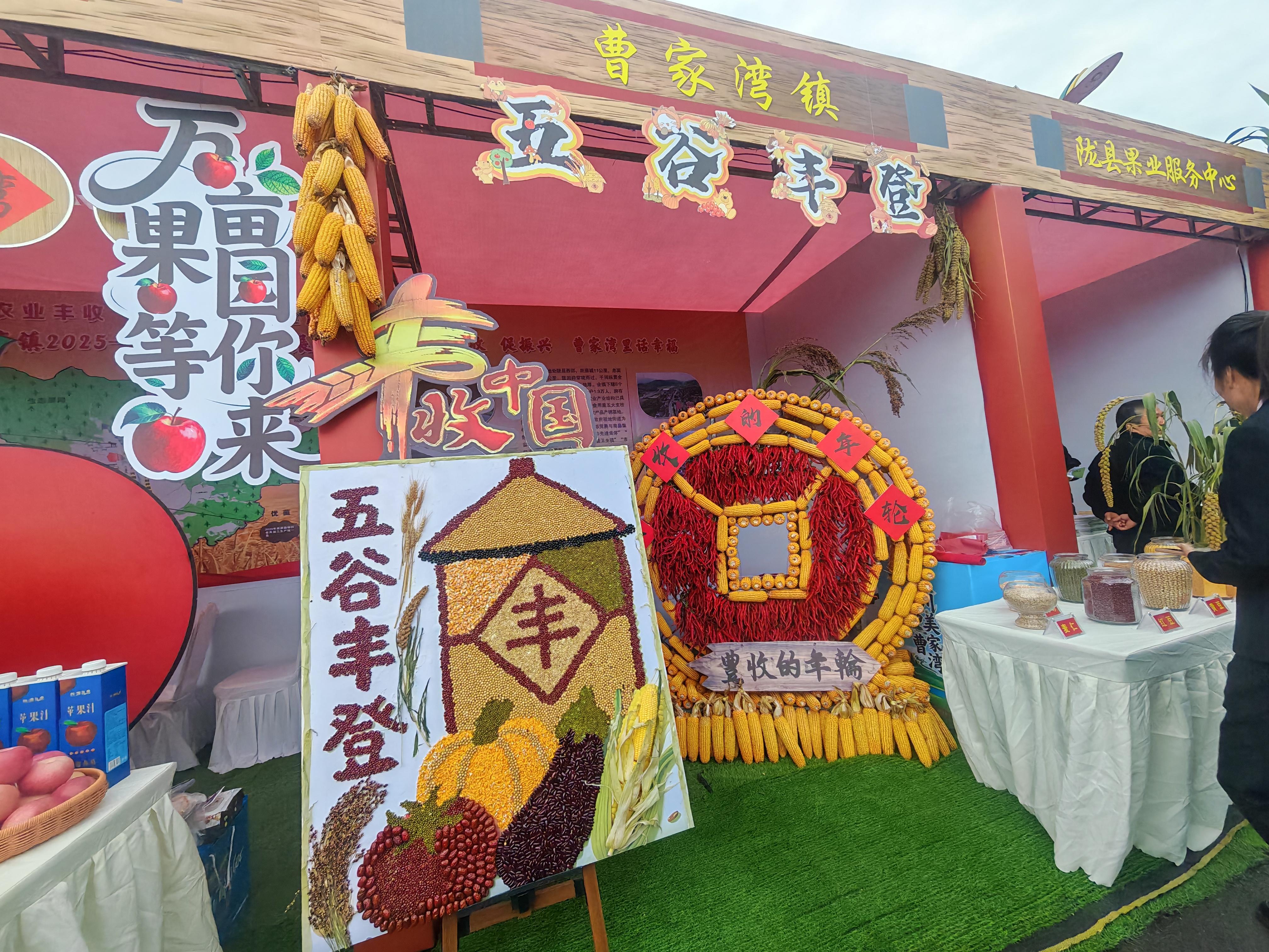 丰收成果展示区呈现出一派琳琅满目、果香四溢的景象。全县10个镇的特色农产品与文化创意产品齐聚于此,曹家湾镇的脆甜苹果和特色面点、河北镇的荞麦系列产品、八渡镇的特色板栗、东风镇的油泼辣子夹馍、固关镇的石板豆腐等美食吸引众多群众驻足品尝;陇县脸谱、传统刺绣等非遗手工艺精美别致,彰显地域文化魅力;绿色无公害的农特产品、新鲜果蔬、畜禽蛋奶和生态蜂蜜也备受青睐,现场购销两旺,真正让丰收的硕果走入千家万户。