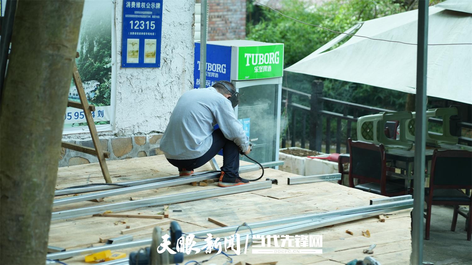 “之前游客来这边看桥,想找个地方坐下来歇歇脚都难。现在搭好凳子,逛累了能坐下来喝口水、聊聊天、看看风景,也能更方便些。”
