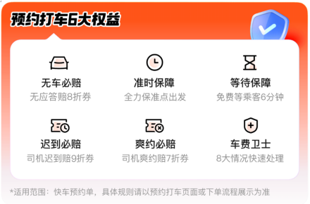 为保障用户对出行的时效要求,滴滴预约打车升级6大权益保障,包括无车必赔、准时保障、等待保障,提升用车体验。同时预约打车推出迟到必赔、爽约必赔等权益,为出行中可能遇到的小变化提供解决方案。