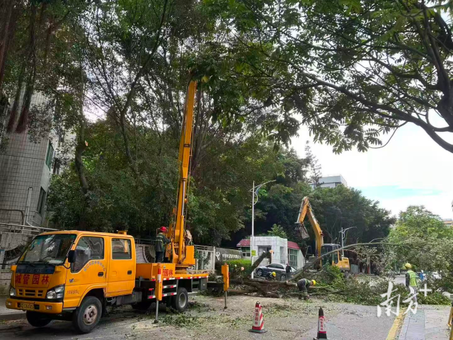 台风来临前,园林部门工作人员正在对树枝进行裁剪。受访者供图