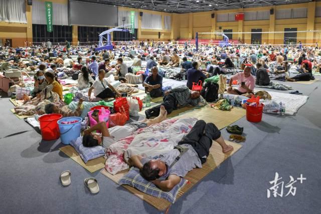 珠海已迅速开放应急避难场所。图为北京理工大学(珠海)的体育馆内,安置于此的约2000名建筑工友正在休息。南方+记者 郑新洽 董天健 摄