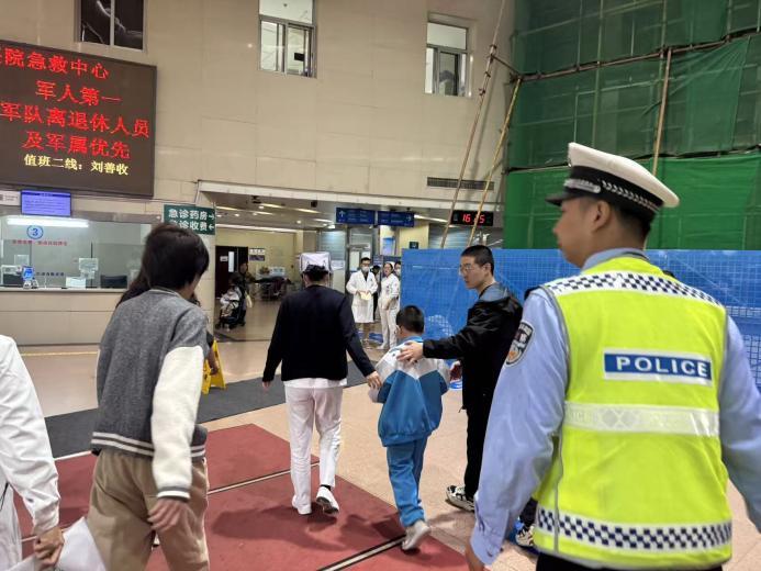 在医院,警员协助家长办理入院手续,看到孩子及时得到救治,孩子父亲拉着警员的手连连道谢,言语间满是焦灼后的安心与感激。警员简单叮咛后,默默返回执勤岗位。