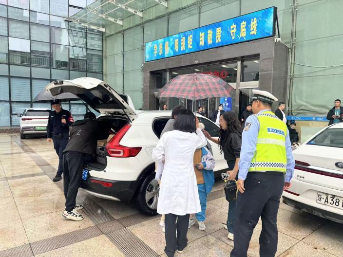 下雨天气车流较大,原本需50分钟的路程,在警车引导和沿途交通参与者主动让行的配合下,仅用27分钟便安全抵达医院。