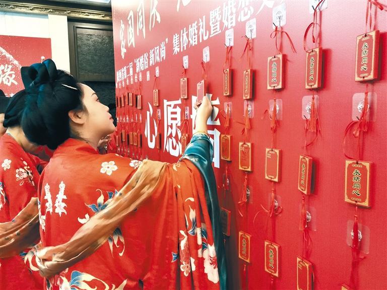9月20日,在陕西省第二届“新婚俗 新风尚”集体婚礼活动现场,新人在心愿墙上写下对美好新生活的期待。 本报记者 杨小玲摄