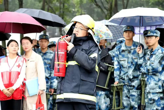 此外,活动还特别安排了消防器材使用教学。保卫处工作人员结合“一站式”学生社区安全需求,详细介绍了各类消防器材的用途和使用方法,并组织新生进行消火栓灭火实操练习。在实践操作中,新生们进一步增强了消防安全意识和应急处置能力。