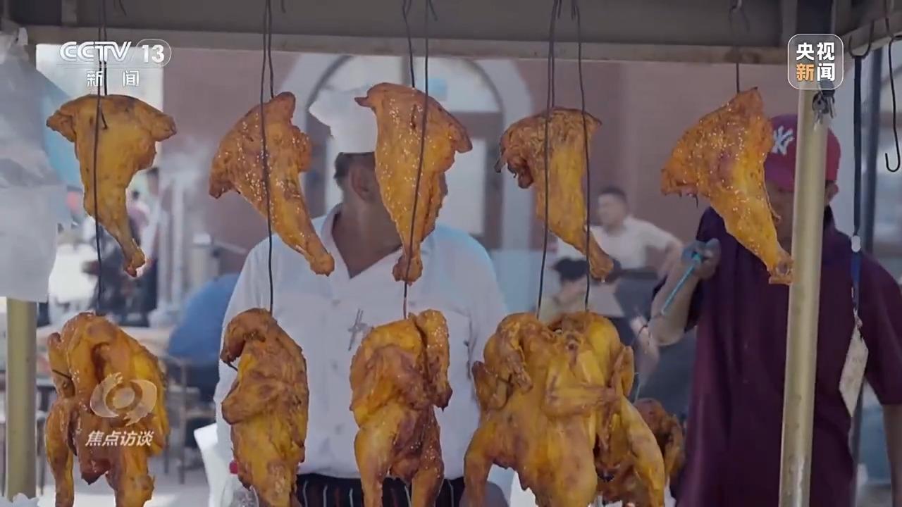 在新疆尉犁县达西村,一年一度的罗布人民俗烧烤节上,各民族的村民用烤肉、烤鱼等特色美食,招待从全国各地来的客人。