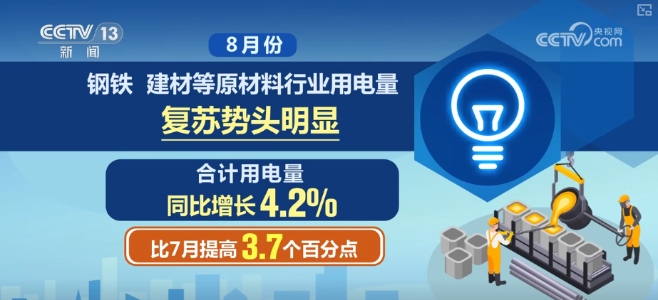 除了制造业,8月份,钢铁、建材等原材料行业用电量复苏势头明显,合计用电量同比增长4.2%,比7月提高3.7个百分点。