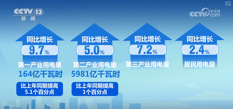数据显示,第一产业和第二产业用电量保持较快增长,第三产业和居民用电量有所回落。具体看,第一产业用电量164亿千瓦时,同比增长9.7%,比上年同期提高5.1个百分点;第二产业用电量5981亿千瓦时,同比增长5.0%,比上年同期提高1个百分点;第三产业和居民用电量分别同比增长7.2%和2.4%。