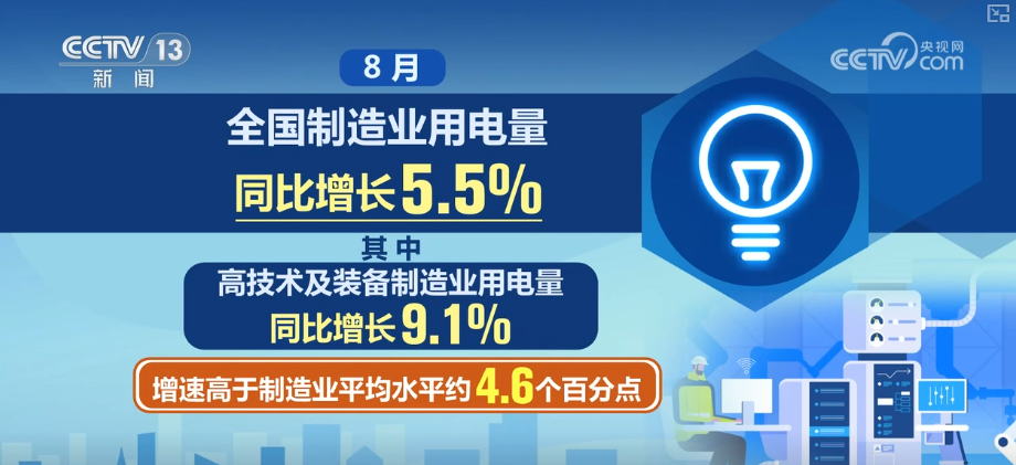 数据显示,8月,全国制造业用电量同比增长5.5%。其中,高技术及装备制造业用电量同比增长9.1%,增速高于制造业平均水平约4.6个百分点。