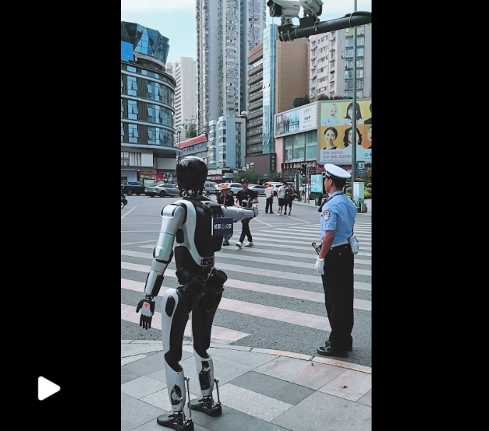 阿加犀智能科技具身智能机器人“通天晓”在成都闹市区,协助交警维护交通秩序。