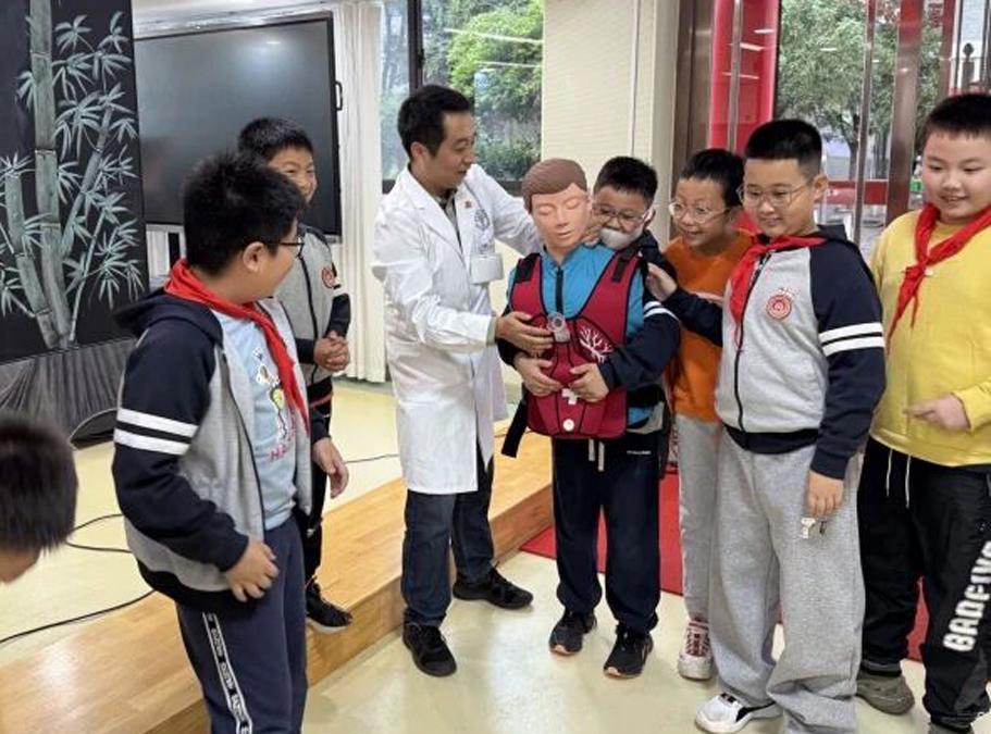 本次活动由医院工会副主席李妲带队,急诊医学科主治医师史小飞担任主讲。史医生结合学生日常校园生活场景,用通俗易懂的语言和典型案例,系统讲解了六类常见校园意外伤害的预防措施与应急处理方法。内容涵盖运动及课间活动中跌倒、球类撞击头面部等伤害的规避要点;文具使用过程中铅笔尖刺伤、尺子边缘划伤及铅笔芯扎入皮肤等风险的防范;以及上下楼梯拥挤摔倒、热饮倾洒烫伤、绿植刺扎划伤、肢体碰撞、牙齿损伤、异物入眼、关门夹手等突发情况的科学处置方法。讲解过程中,史医生通过现场演示和互动教学,帮助学生们在实践中掌握了实用的急救技能。