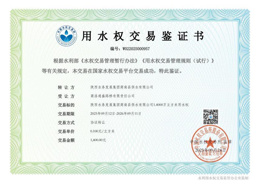 三秦都市报—三秦网讯(刘 航符甲戌 记者闫鹏飞)9月25日,陕西水务发展集团商南县供水有限公司与商洛通盛路桥有限责任公司通过国家水权交易平台达成一笔1.4万吨富余取水权交易,标志着商南县首例工程领域水权交易顺利落地,也是商南县探索生态产品价值实现机制的一项重要突破。本次交易将水资源作为重要生态产品,通过市场化流转方式盘活闲置资源,是践行“绿水青山就是金山银山”理念、推动生态产品价值有效转化的一次生动实践。