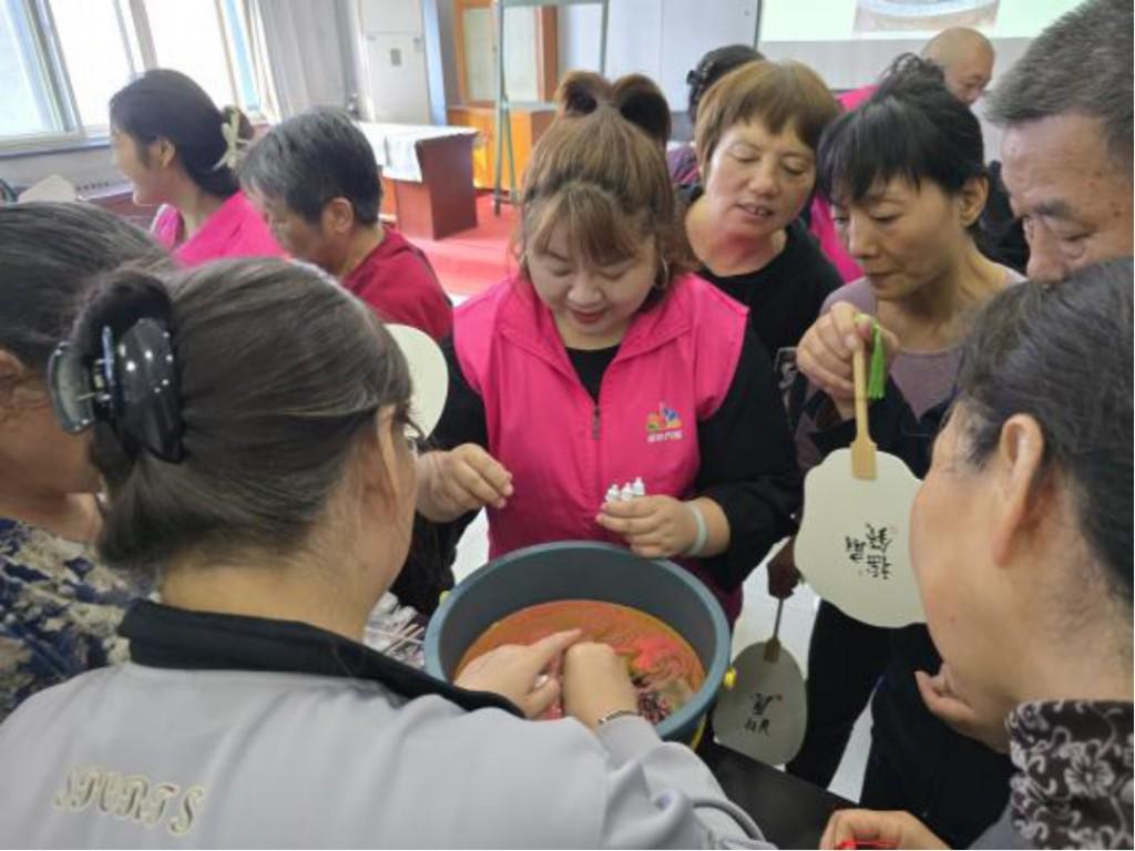 接着,老师现场演示漆扇制作过程。只见她将各色漆料轻轻滴入水中,用工具吹开斑斓的纹路,再将素白扇面缓缓浸入,轻轻旋转……片刻之后,原本洁白的扇面便呈现出流光溢彩、变幻莫测的图案,宛如一幅流动的画卷。居民们看得目不转睛,纷纷赞叹非遗技艺的神奇魅力,跃跃欲试。