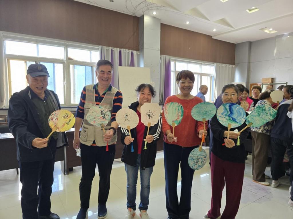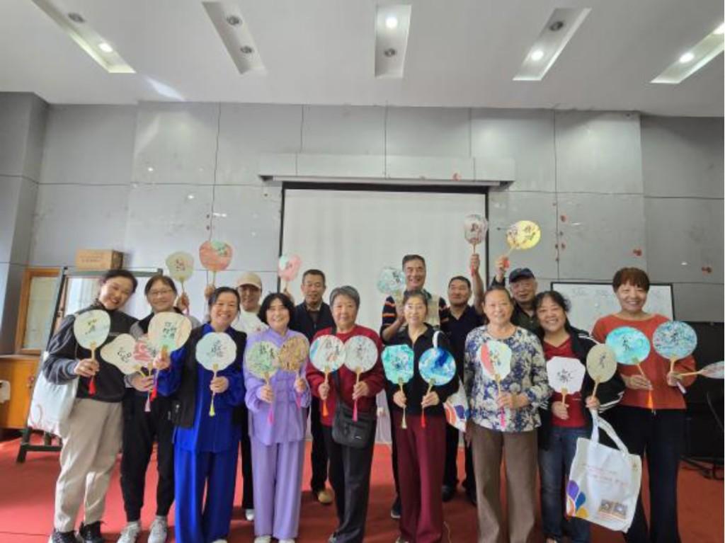 在动手制作环节,活动中心瞬间化身为创意工坊。大家围坐在一起,精心挑选色彩,小心翼翼地滴漆、吹纹、浸扇。邻里之间相互交流技巧,分享配色心得,“你这个颜色搭配得真好看!”“这里加点金色,像星星一样!”温馨对话此起彼伏。现场其乐融融,一把把素白的扇面在居民巧手中逐渐变得绚丽多彩,承载着中秋的诗意与团圆的美好。