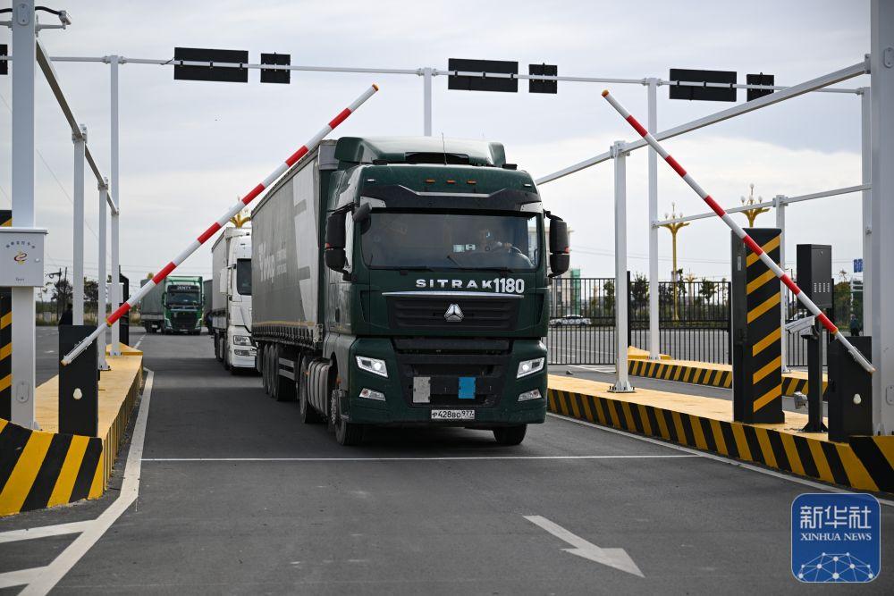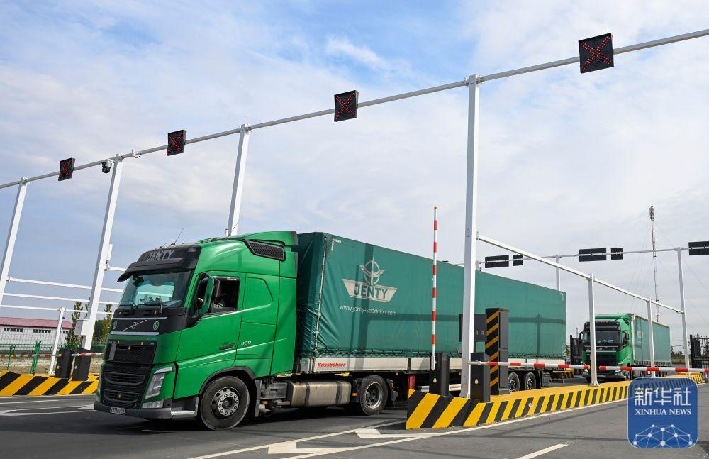 ↑9月17日,来自俄罗斯的货车从位于新疆塔城地区的巴克图口岸海关集中查验场地出关。新华社记者 王菲 摄