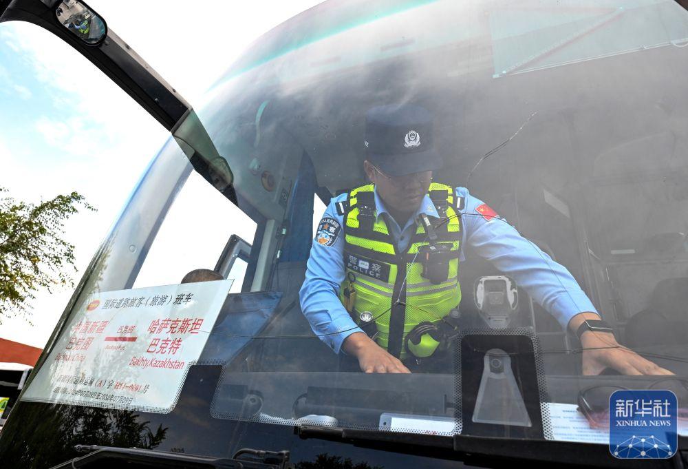 ↑9月17日,巴克图出入境边防检查站的移民管理警察在巴克图口岸查验经由该口岸出境前往哈萨克斯坦的客车。新华社记者 王菲 摄