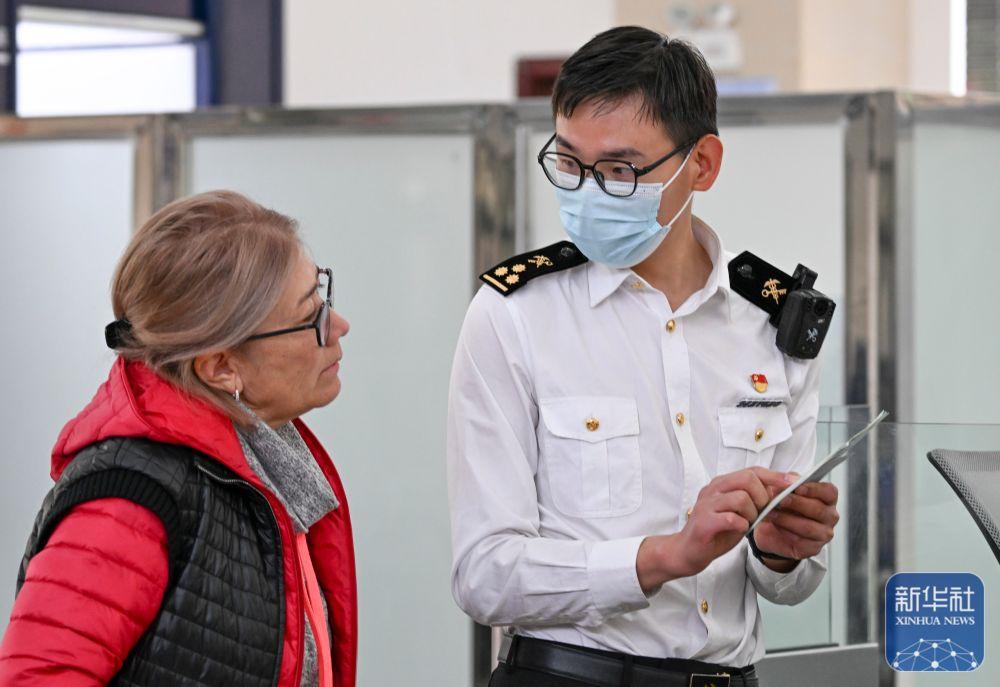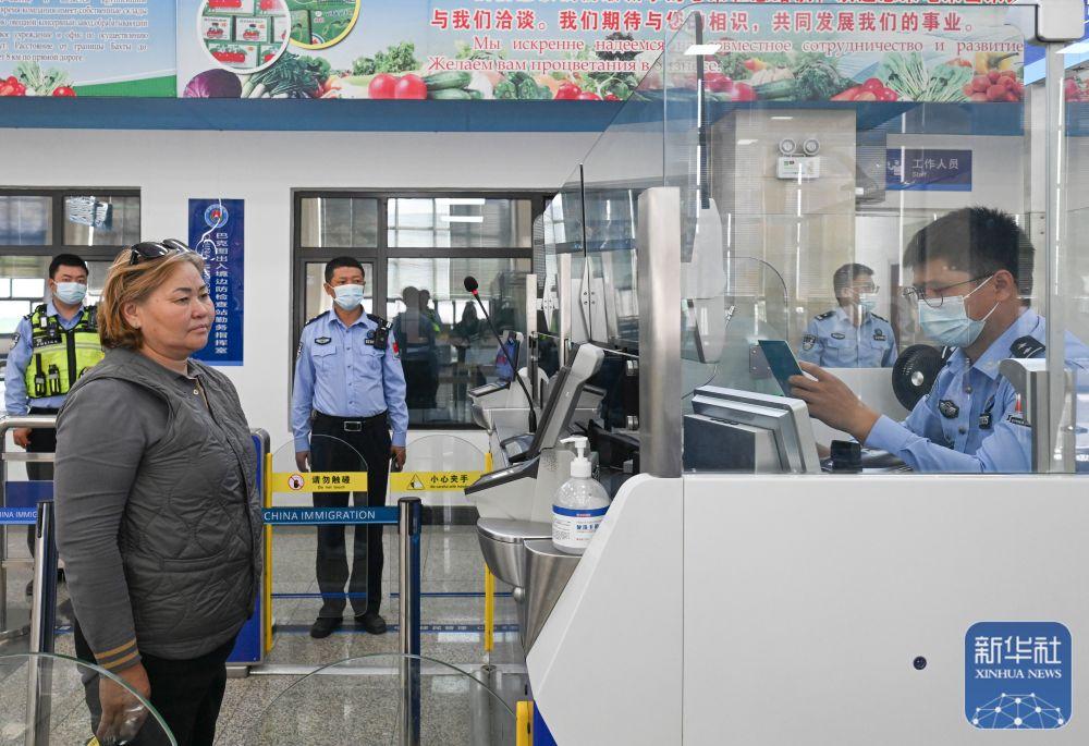 ↑9月17日,巴克图出入境边防检查站的移民管理警察在为来自哈萨克斯坦的旅客办理入境手续。新华社记者 王菲 摄
