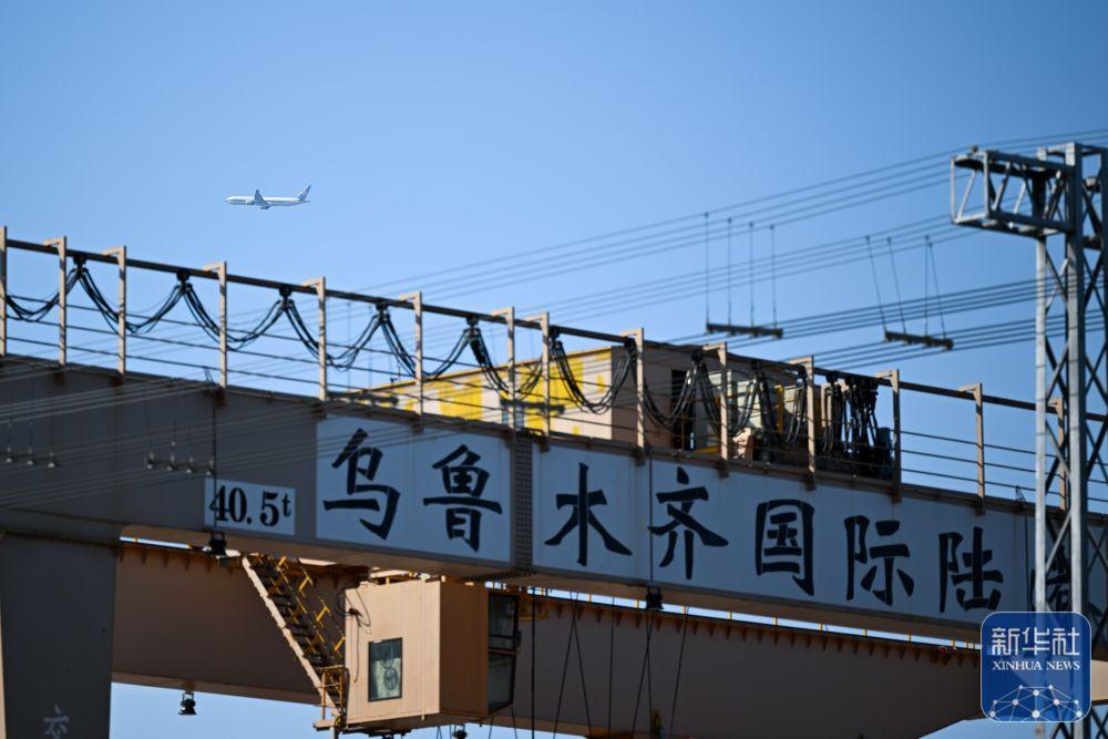 ↑9月15日,一架飞机从乌鲁木齐国际陆港区上空飞过。新华社记者 辛悦卫 摄