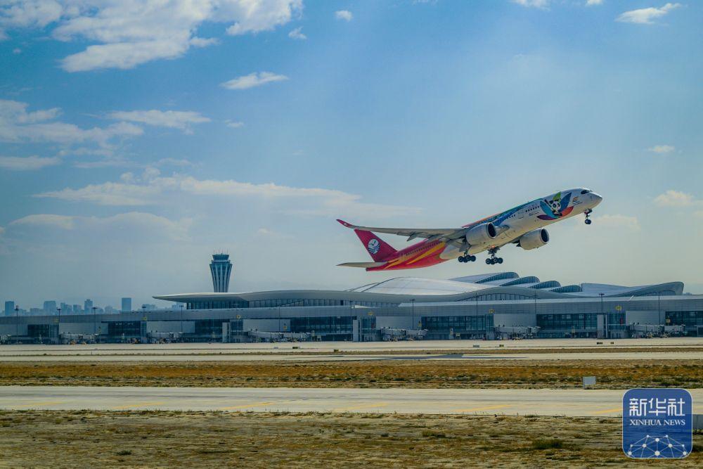 ↑9月15日,一架飞机从乌鲁木齐天山国际机场起飞。新华社记者 陈朔 摄