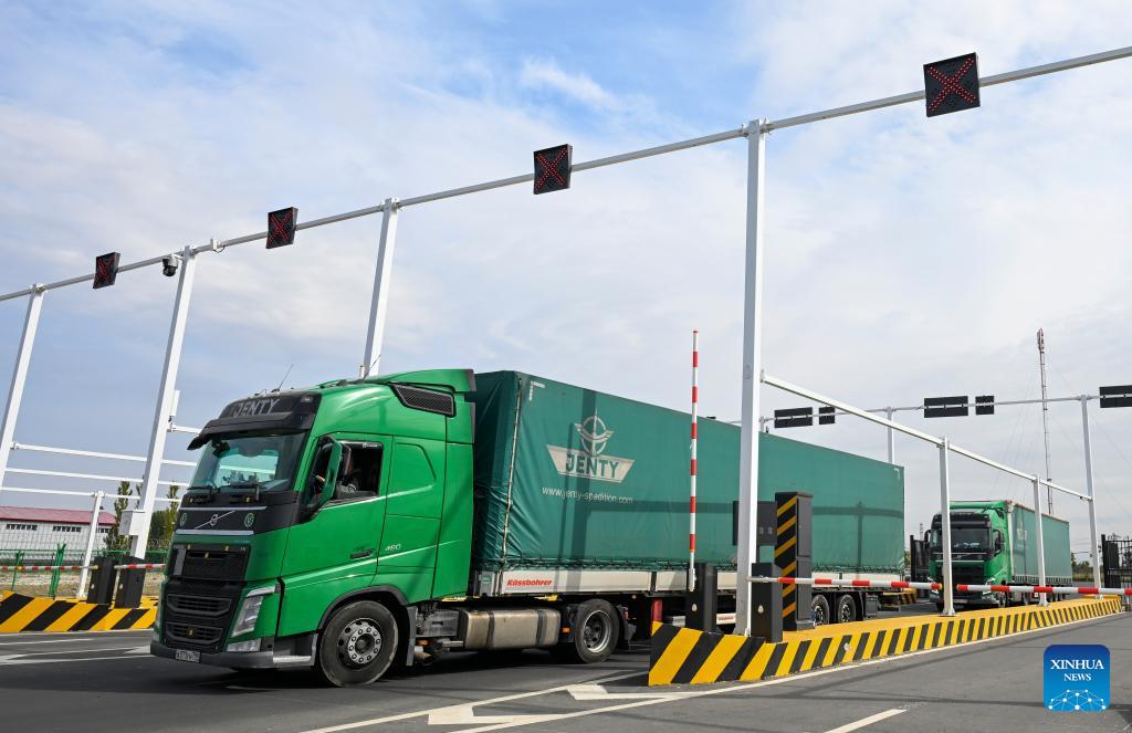 Trucks from Russia leaves the Bakti port after inspection, in Tacheng, northwest China's Xinjiang Uygur Autonomous Region, Sept. 17, 2025. Xinjiang is seeing increased vitality across the board as the region accelerates its efforts to the construction of the New International Land-Sea Trade Corridor, a key logistics network connecting China's western regions to global markets.