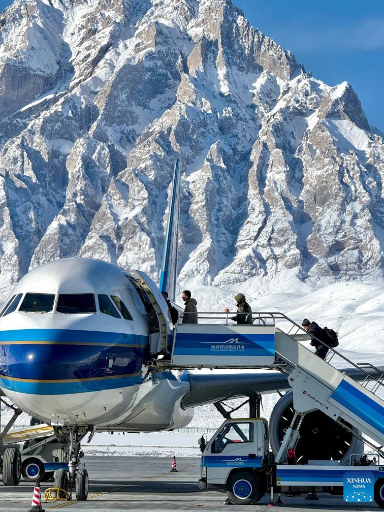 Passengers board an airplane at the Taxkorgan Khunjerab airport in Taxkorgan Tajik Autonomous County, northwest China's Xinjiang Uygur Autonomous Region, Jan. 13, 2025. Xinjiang is seeing increased vitality across the board as the region accelerates its efforts to the construction of the New International Land-Sea Trade Corridor, a key logistics network connecting China's western regions to global markets.