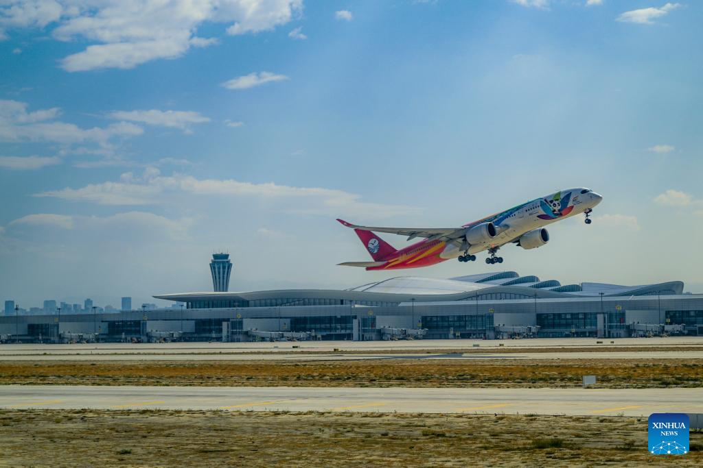 An airplane takes off at Urumqi Tianshan International Airport in northwest China's Xinjiang Uygur Autonomous Region, Sept. 15, 2025. Xinjiang is seeing increased vitality across the board as the region accelerates its efforts to the construction of the New International Land-Sea Trade Corridor, a key logistics network connecting China's western regions to global markets.
