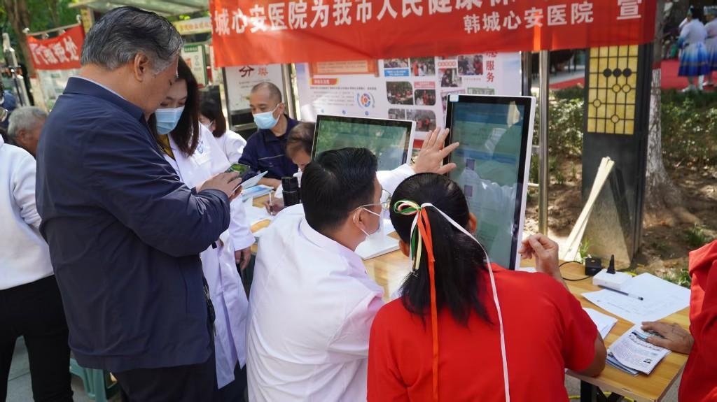 广场另一侧,便民服务区暖意融融。韩城心安医院的医生俯身为老人李女士测量血压,并叮嘱:“您血压有点偏高,平时要少放盐、多吃芹菜,坚持每天散步。”