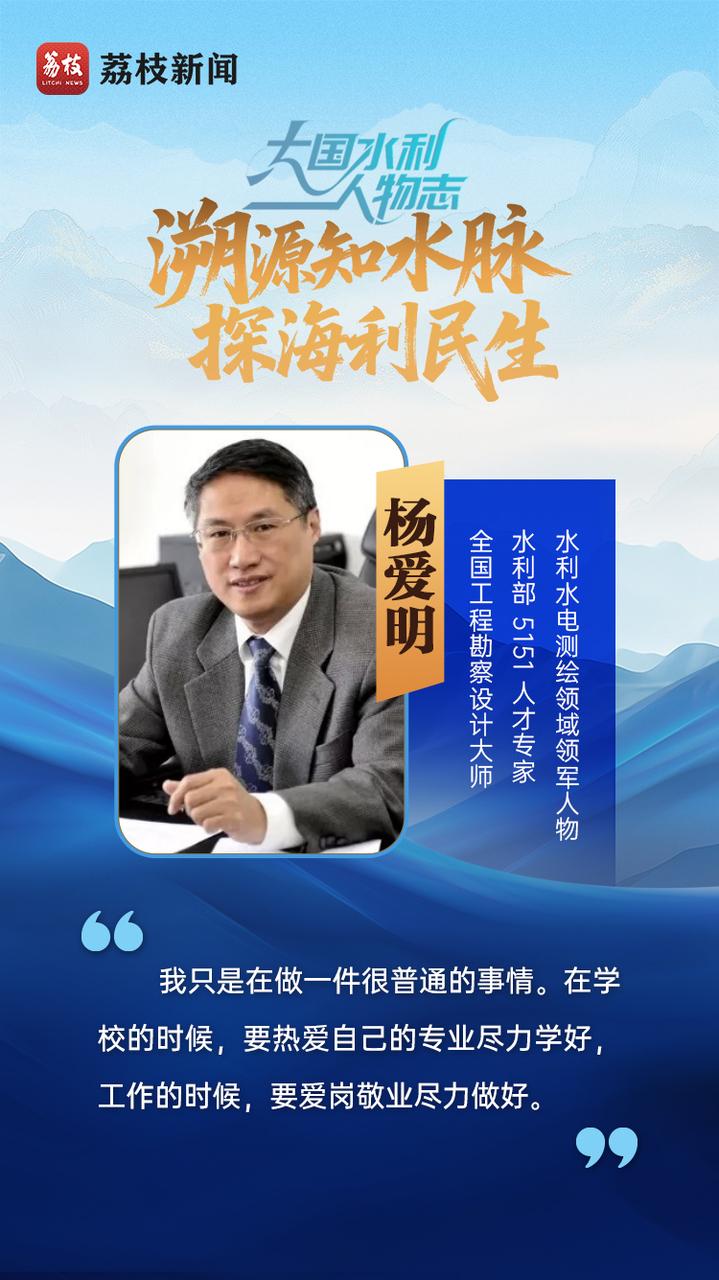 水利测绘工作者是为水利工程做量尺的人。早期的杨爱明背着水准仪、经纬仪,跋山涉水,一走就是四十年。从三峡、乌东德、糯扎渡,再到南水北调中线、滇中引水,他让万里河山横眼底,让国之重器“活”起来。南水北调中线工程和滇中引水工程,是世界最长线路和最大高差的调水工程。在测量工作中,他带领团队提出“窄分带投影”和“适应高程变化的补偿投影模型”,形成了一整套超长调水工程施工测量控制系统解决方案,填补了技术空白。