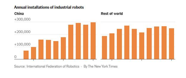 报道称,就工业机器人而言,中国拥有众多优势。中国有大量能安装机器人的熟练电工和专业计算机程序员。此外,中国的人工智能行业高度聚焦于运用这项新技术来追踪和优化工厂设备性能的各个环节。