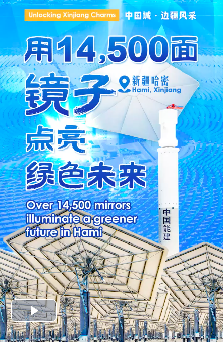一面镜子,可以折射阳光,十面镜子,可以汇聚能量。而当一万多面镜子齐聚戈壁,又能汇聚多少能量? 新疆哈密就有一片浩瀚的“镜海”——50兆瓦熔盐塔式光热发电站——它将戈壁的日照转化为源源不断的清洁电力,点亮千家万户的生活。如今,哈密依托得天独厚的太阳能资源,不断建设光热、光伏、风能与储能多能互补的绿色能源基地,汇聚成推动能源转型的“绿色矩阵”。
