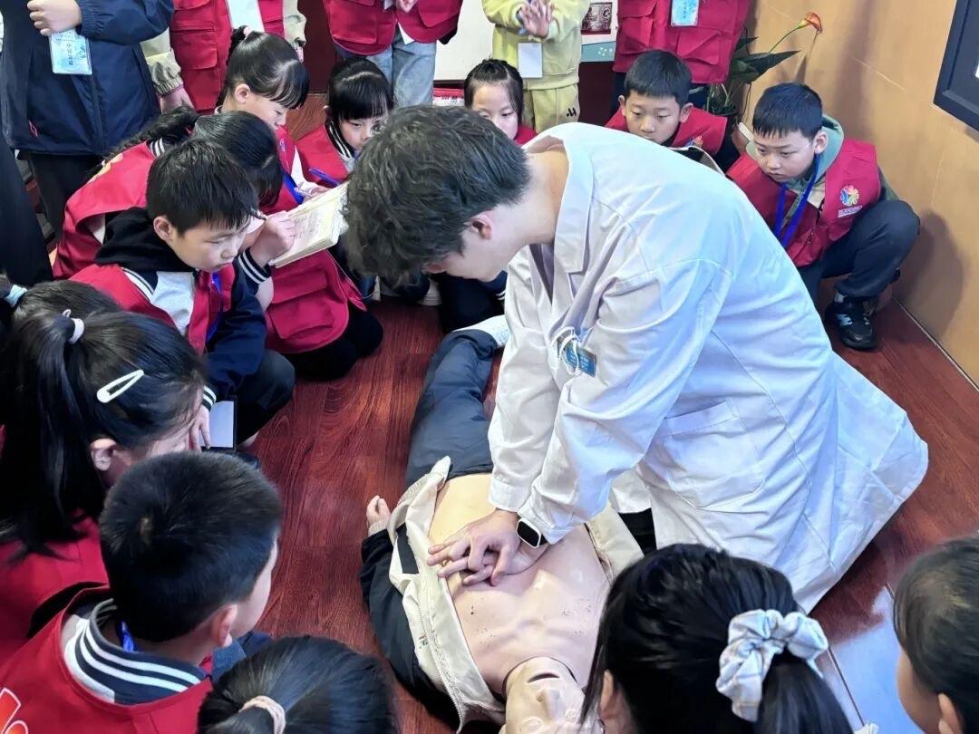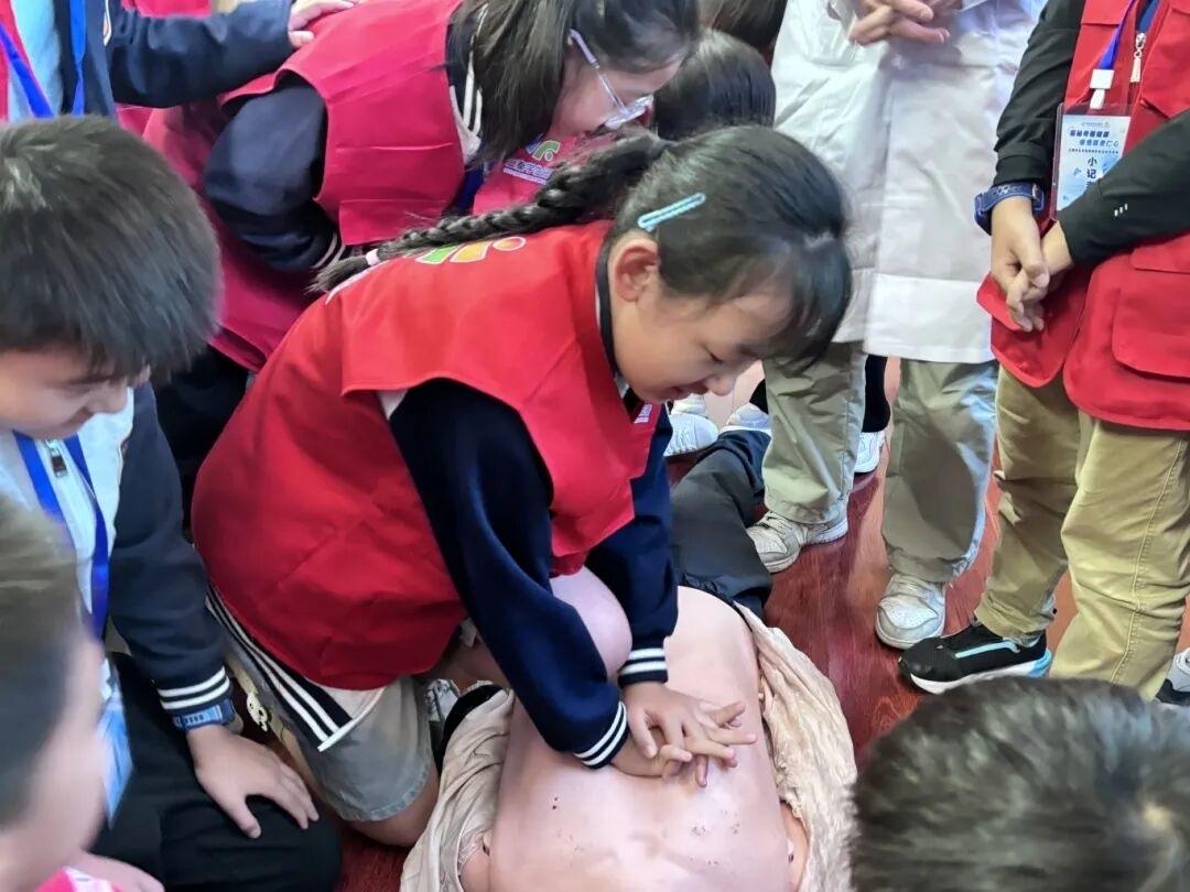 在急救知识课堂,急诊科主任郭晓军带来了实用的急救知识讲座。从常见意外的应急处理原则到具体的操作方法,郭主任结合生动的案例,用通俗易懂的语言进行讲解,原本专业性极强的急救知识变得生动易懂。在实际操作环节,孩子们更是跃跃欲试,在郭主任和医护人员的指导下,纷纷上手进行急救演练,从动作生疏到逐渐标准,每一个孩子都展现出了认真专注的态度。